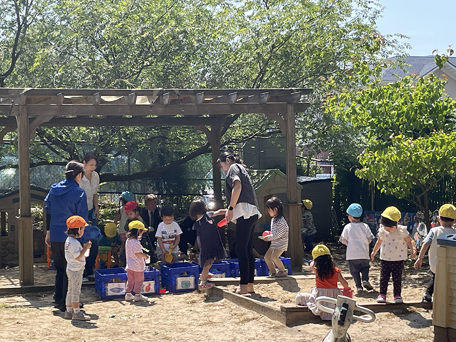 NJ校に到着後は、初めての場所にやや緊張した様子も見られたが、年少クラスとの合同保育が始まると次第に表情もやわらぎ、打ち解けた様子でのびのびと過ごしていた。広々とした園庭では、遊具や砂場、シャボン玉遊びなど普段とは違う遊びに夢中になる子どもたちの姿が多く見られた。思いっきり自由に走り回れたのが楽しかったようで、園庭には子どもたちの笑顔と歓声があふれていた。