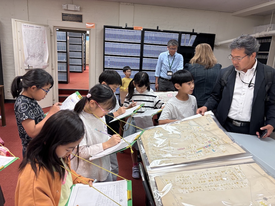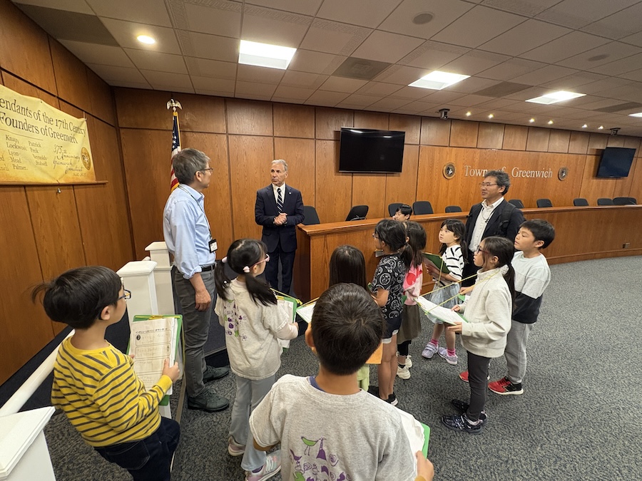 図書館の後はグリニッチ市庁舎を訪れ、施設内を見学した。地下の部屋では、町に伝わる古文書や古地図に触ったりしながら学びを深めた。2019年からグリニッチのファーストセレクトマン(第一選任委員)を務めるフレッド・カミロ・ジュニアさんからも町の歴史や市庁舎の仕事について話を聞いた。子どもたちは「なぜファーストセレクトマンになろうと思ったのですか」「なぜグリニッチはアメリカの中で最も住みやすい町といわれているのですか」などと質問をした。