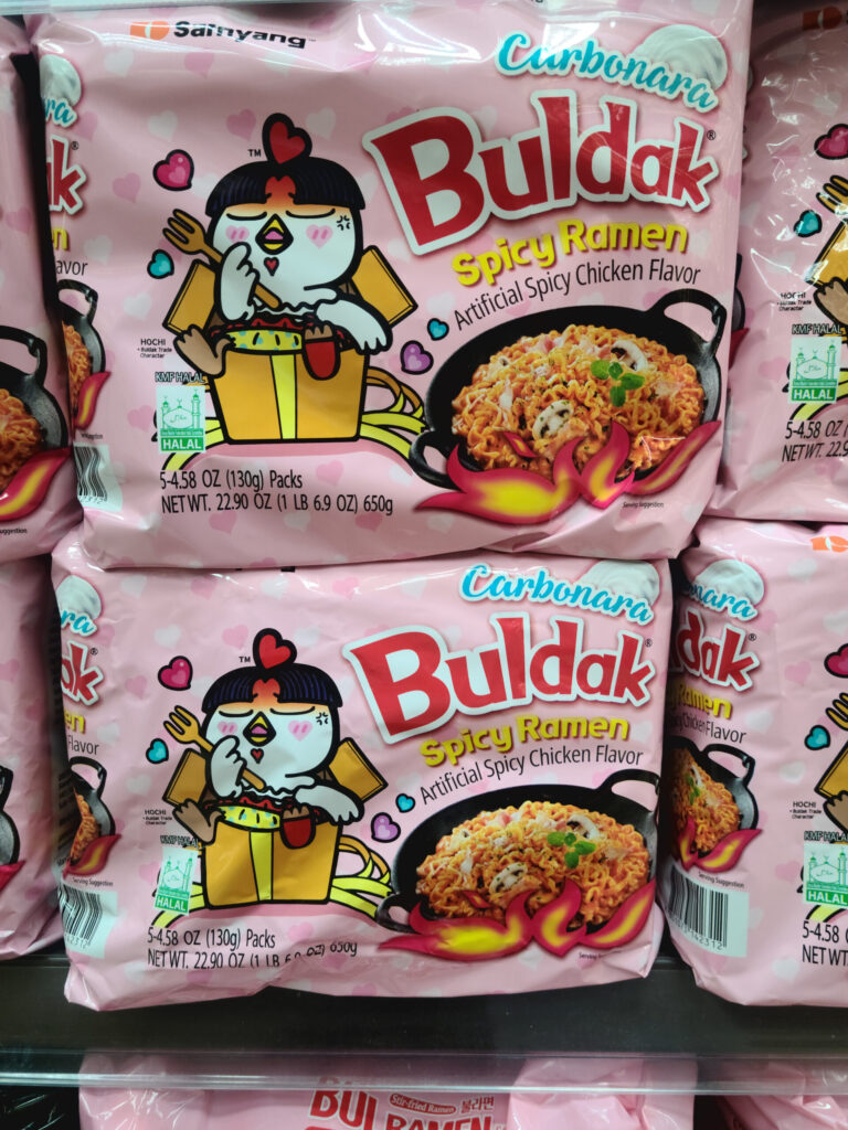 ブルダックは辛さがウケて、タイのストリート・フードとして親しまれている。いろんな味があって楽しいのも特徴。そのなかでも、カルボナーラ味は比較的マイルドで美味しい。それでもやっぱり辛いけどね。