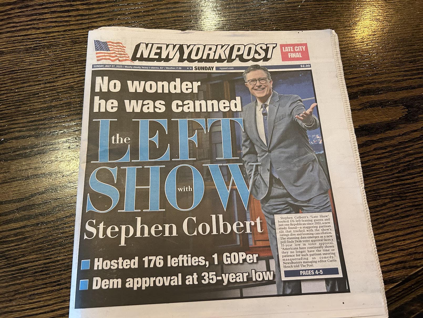 トランプ氏のお気に入り新聞、NYポストは27日、コルベア氏が番組のゲストとしてリベラル派を176人呼んだのに対し、保守派は1人だったと報じて批判した(27日、クイーンズ / Photo: Keiko Tsuyama )