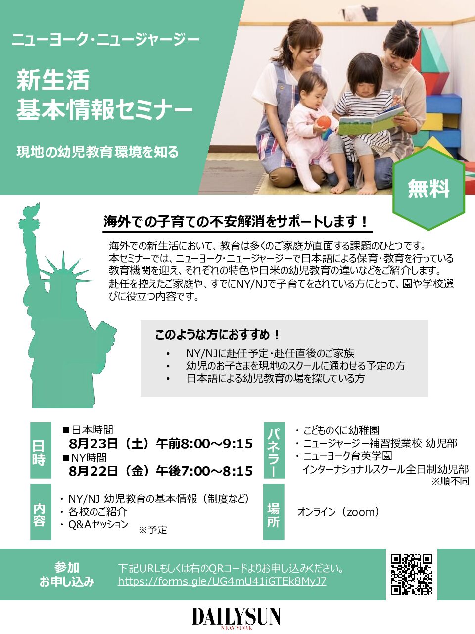 本セミナーでは、ニューヨーク・ニュージャージーで日本語による保育・教育を行っている教育機関を迎え、それぞれの特色や日米の幼児教育の違いなどをご紹介します。