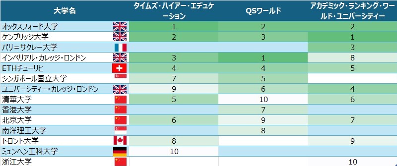 出版社はタイムズ・ハイアー・エデュケーション、QSワールド、アカデミック・ランキング・ワールド・ユニバーシティー。
