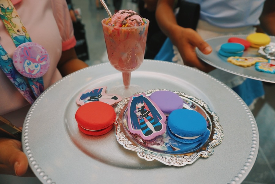 会場内でメイドカフェの店員風なニューヨーク在住の2人組を見つけたので、さっそく話を聞いてみると、「毎年楽しみにしていて、今年はメイドカフェの店員になってみました。実はこの衣装、そしてキャラクターも自分たちで考えたんです!」とのこと。彼女たちが手にしていたトレイには、マカロンやパフェ、そしてオリジナルキャラのフィギュアまで乗っており、もちろんこれも手作りだ。