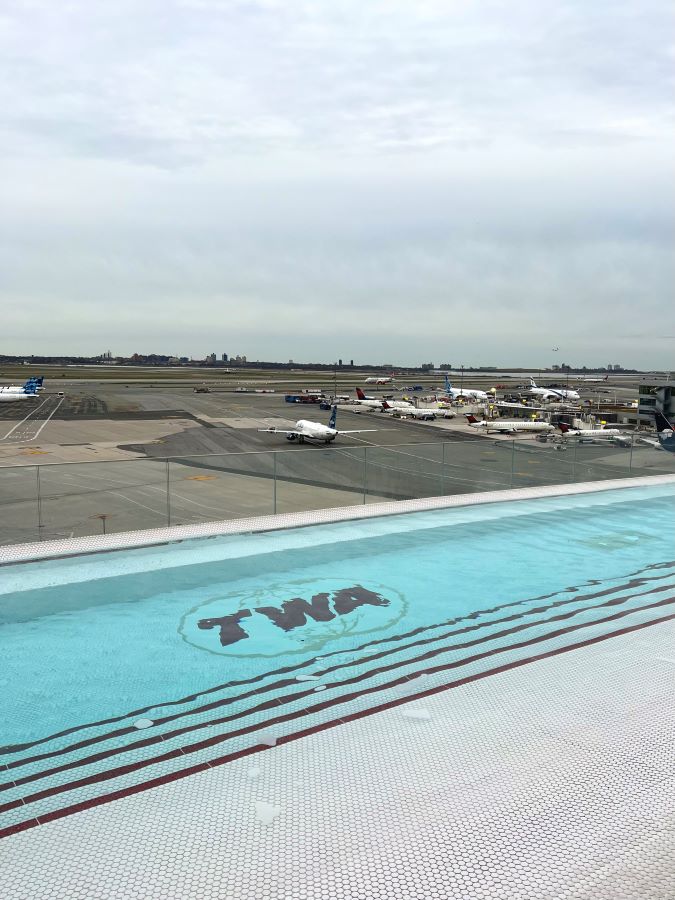 飛行機好きには絶対行って欲しいホテルのルーフトップバーはこちらです。実際に使用していたTrans World Airlinesのターミナルを2019年にホテルにリノベーションした、その名もTWAホテル。屋上にはバーのみならず、温水のインフィニティープールもあり、カクテルを片手に飛行機の行き先を想像すれば旅行気分を味わえるかもしれません。中庭にあるビンテージのセスナ機内にもバーがあり、機内の座席で飲むことも可能です。JFK空港内唯一のホテルで、エアトレインで行けます。空港という非日常空間は、宿泊はもちろん、短時間の滞在でもくつろげるので現実逃避にもってこい。