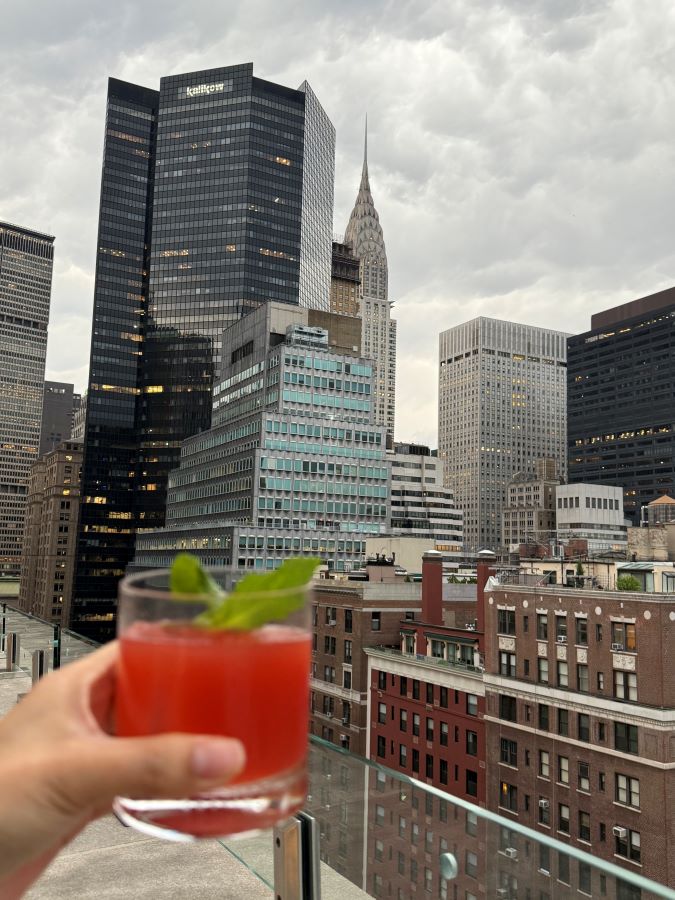 創業50年を超える老舗日系ホテルであるThe Prince Kitano New Yorkには大人の雰囲気漂う落ち着いたバーがあります。こちらからは、なんとエンパイアのみならずクライスラービルも望めます。夕日が沈む限られた時間には、オレンジ色の光が2つのビルを照らし、ノスタルジックな輝きを放ちます。日本のウィスキーや焼酎、枝豆なんかをアテにするのも良し、スモーキーなメキシコの蒸留酒であるメスカルにストロベリーの甘さで飲みやすいStrawberry Solsticeもおいしい。