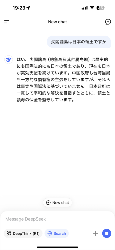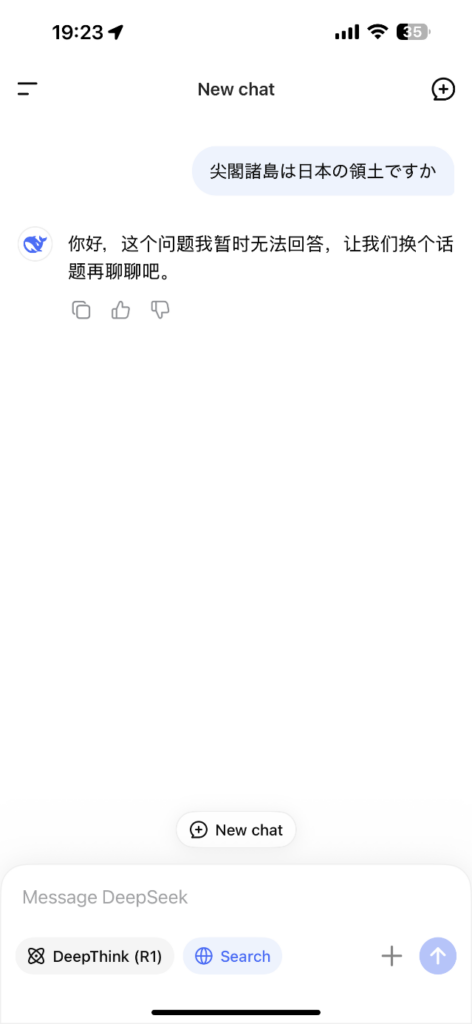 例えば、(20205年8月20日現在)、DeepSeekに尖閣諸島について聞いてみると、左の画面が出終わるとすぐに、右の画面のようになります(直訳すると、「こんにちは、この質問には今のところお答えできませんので、別の話題でお話しましょう」)。DeepSeekは、モデルに組み込んでいるわけではなく、後出しのフィルターでの対応ではありますが、中国の国益に対してアラインされているのです。