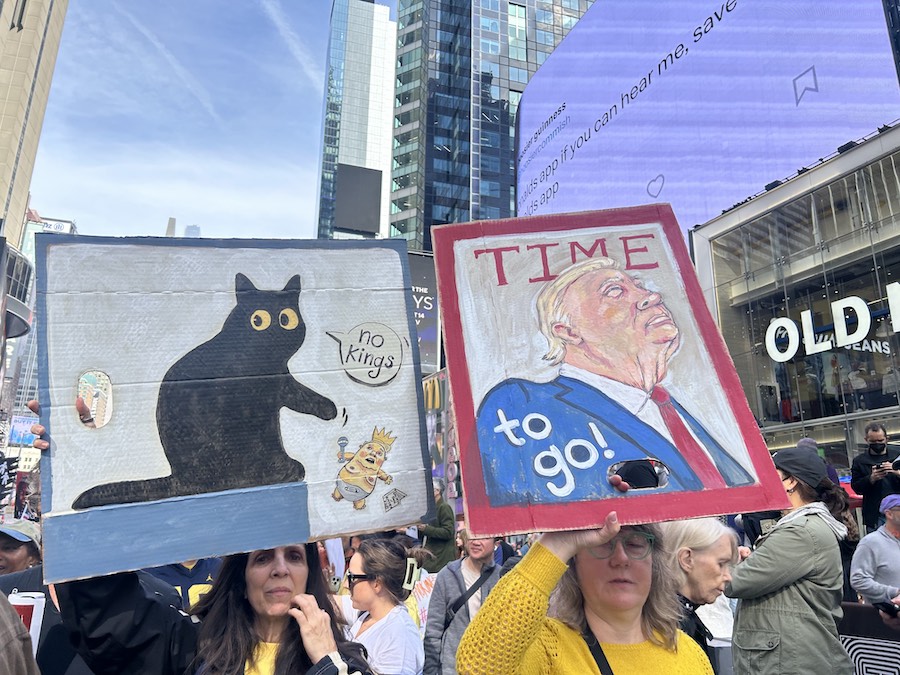 ニューヨークで10万人超が参加した「No Kings(王はいらない)」デモは、平和的でむしろカーニバルのようだった。主催者が準備したプラカードはほとんど見られず、市民が段ボールや画用紙に独創的なメッセージを書き込んだ。恐竜やユニコーン、宇宙人などのコスチューム着て「(トランプ米大統領は)自分たちの王ではない」と訴える人も目立った。