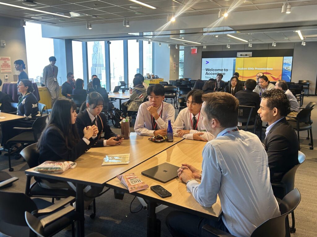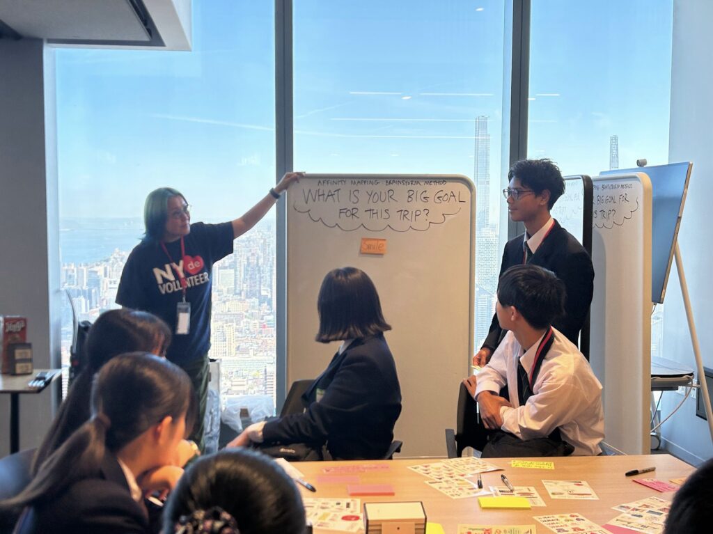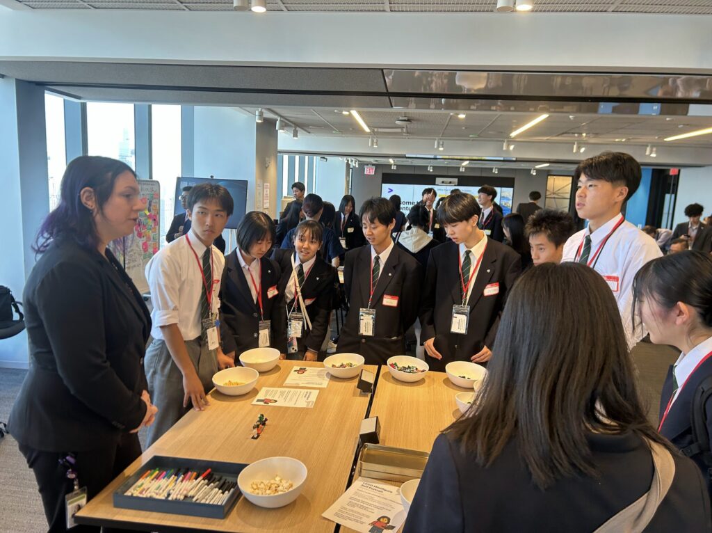 プログラムはマンハッタン中心部にそびえる高層ビルの61階にあるオフィスで実施されました。眼下に広がる街並みを前に、生徒たちはやや緊張した面持ちでスタート。最初に行われたのは、社員によるオフィスツアーとアイスブレイク。自由に席を選べるフリーアドレス制のデスクや、世界中とつながる会議システムなど、最新のワークスタイルに生徒たちは興味津々。「ここで働いてみたい!」という声も聞かれました。