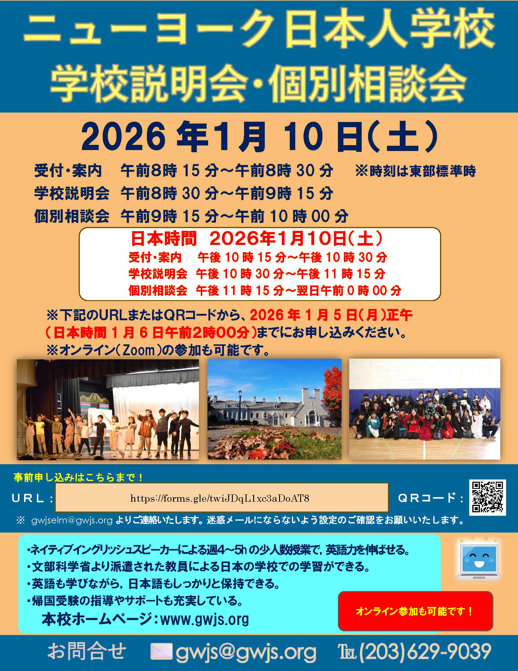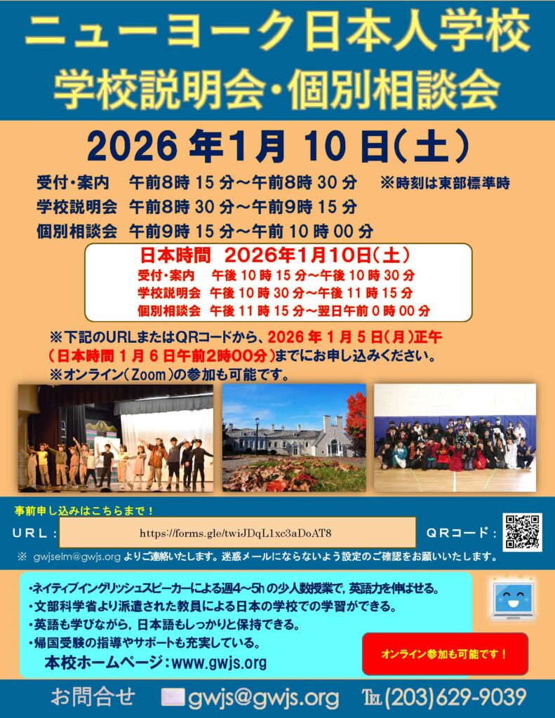ニューヨーク日本人学校(コネティカット州グリニッチ、森本恵作校長)は2026年1月10日(土)午前8時30分から、学校説明会および個別相談会を開催する。