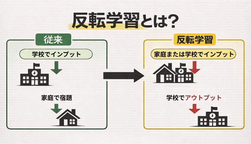反転学習では、家庭で動画を見てインプットを行い、学校では考える・話す・表現するアウトプット活動を中心に行う。