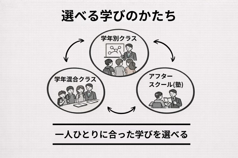 学年別クラスが合わなかった場合は、いつでも混合クラスへ移動できる柔軟な仕組みも用意されている。また、さらに学びを深めたい子にはアフタースクールの塾を併用することもできる。