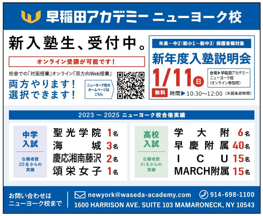 早稲田アカデミー・ニューヨーク校は、生徒・保護者と共に「合格」の先にある未来を創造すべく、最新の受験情報とトップレベルの指導をご提供いたします。本年も、何卒よろしくお願い申し上げます。
