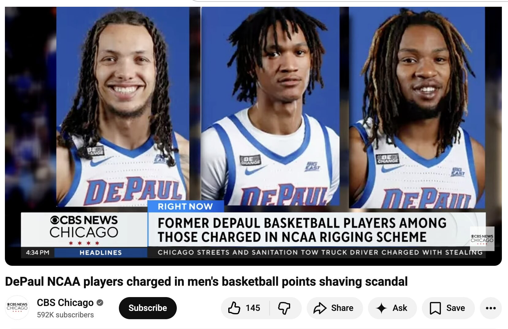 八百長に関与したとして起訴されたデポール大学の選手(photo: CBS ChicagoのYouTube, https://www.youtube.com/@CBSChicagoからスクリーンショット=2026年1月16日)