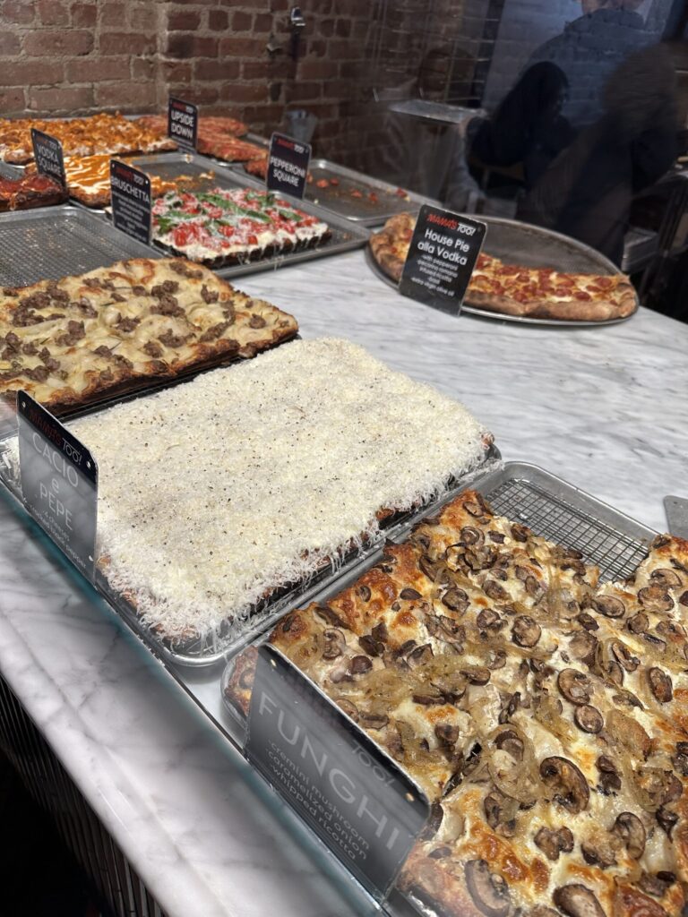 氷点下の厳寒の中、本紙編集部員も同店に突入、世界一のカチョ・エ・ペペのスライスを実食してみた。店内は午後3時くらいだった、賑わっていた。ショーウィンドウに並んだ四角いピザは、11種類もあるバリエーション豊かな味やカラフルな見た目がおしゃれでニューヨークらしい。サーブする前にオーブンでさっと溶かしたチーズは想像以上に濃厚で、粗挽きした黒コショウがピリッと効いている。生地は外側がパリッと香ばしく、一言でいえば“大人がハマる味”。赤ワインやビールとの相性も抜群だ。