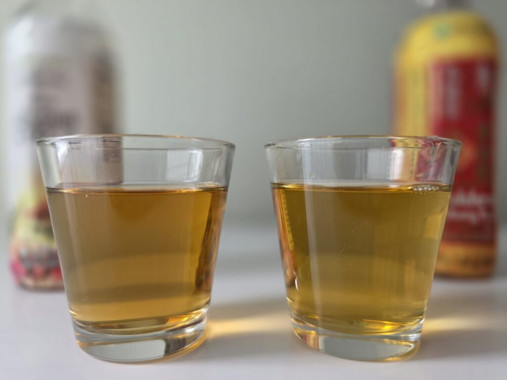 お茶の色は、トレジョの商品はやや濃いめ。一方、伊藤園は、やや薄く澄んだ黄金色といった印象。味わいについても違いは明確だった。トレジョは柔らかく軽やかで飲みやすいが、深みという点ではやや劣った一方、伊藤園は非常にしっかりとした味で苦みも強く、後味まで濃さが続く。