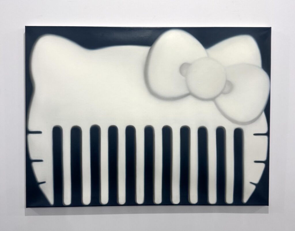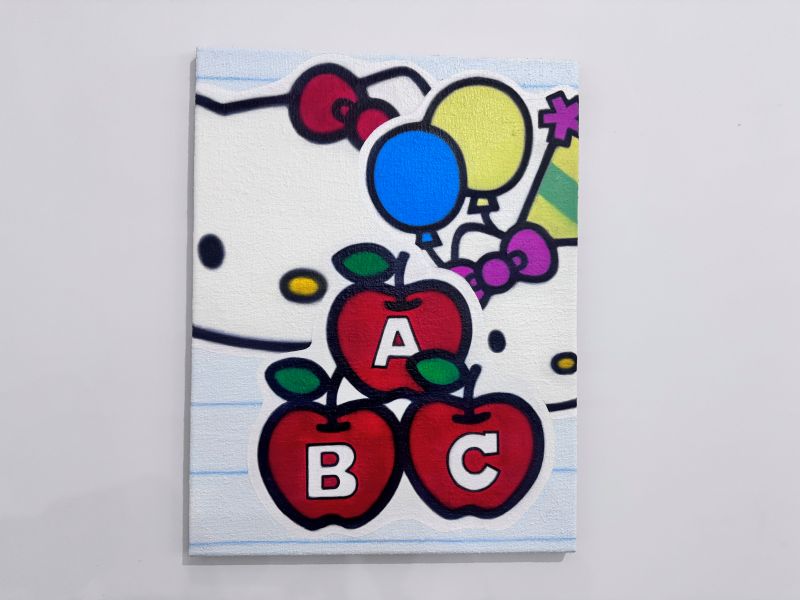 Leeは、ハローキティの顔や形をあえて崩し、分解し、再構成する。子どもの頃に親しんだステッカーやパズル、日用品などのモチーフも取り入れ、作品は一見ポップで懐かしい。しかし、よく見るとどこか違和感がある。不思議な緊張感をはらんだシリーズとなっている。