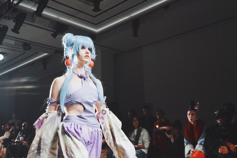 また会場でひときわ注目を集めていたのが、Ao Miyasakaさんのコレクション。自身の経験を基にした「暴力による死」や「過去の自分」をテーマに落とし込み、日本の伝統工芸品が織りなす匠の技とともに力強いコレクションを披露した。京都の職人が手がけた般若を取り入れた象徴的なドレスには観客が見入っていたが、実は裏ではアクシデントも起こっていた。