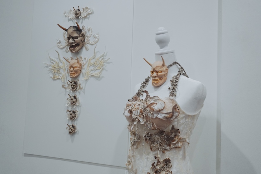 「日本の精神性やものづくりはすごく緻密で繊細で、真剣度がすごい。それは他の国と比較するわけではなく、その姿勢に、私はときめきを感じます。今回のコレクションには、京都の職人さんがショーのために特別に作ってくださった般若や、福井のテキスタイル会社が手がける和紙とベルベットが重なった作品など、他にも日本で作られたさまざまな素材を使わせていただいています。私の人生を賭けて向き合っているテーマは簡単なものではないので、より芯の通った表現として昇華させるために、コレクションには真面目な素材を取り入れたいという思いがあって」