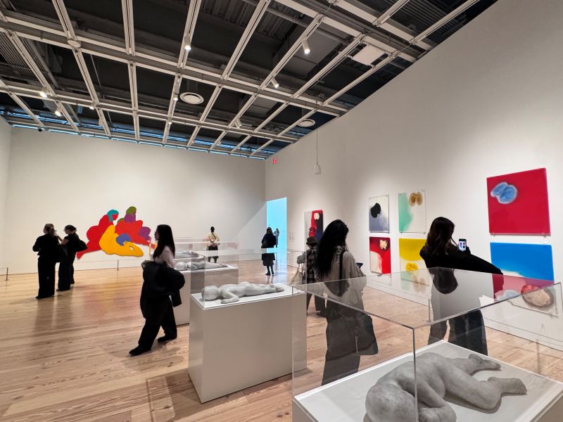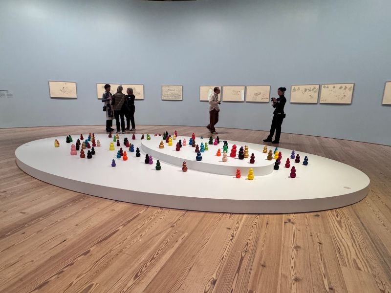 カラフルなひょうたんのようなアートが並んでいる 展覧会は美術館のギャラリーだけでなく、ロビーや屋外空間など、建物のさまざまな場所に広がる。