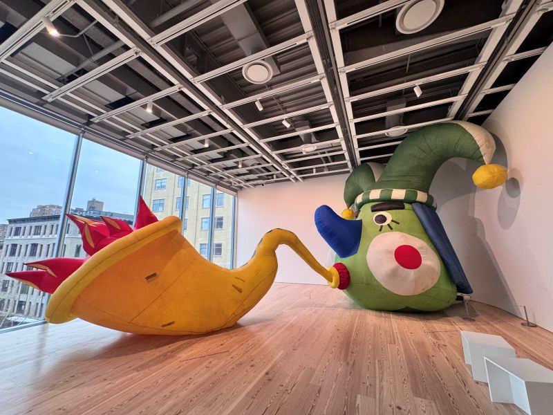また、 パット・オレスコ(Pat Oleszko)による巨大なインフレータブル彫刻「Blowhard」は、ナイロン製の巨大なピエロ帽子とラッパのような形をした作品で、空気を送り込むことで膨らむ「インフレータブル彫刻」だ。タイトルの「Blowhard」は英語で「大口を叩く人」という意味で、政治家や権力者の空虚な言葉をユーモラスに風刺している。