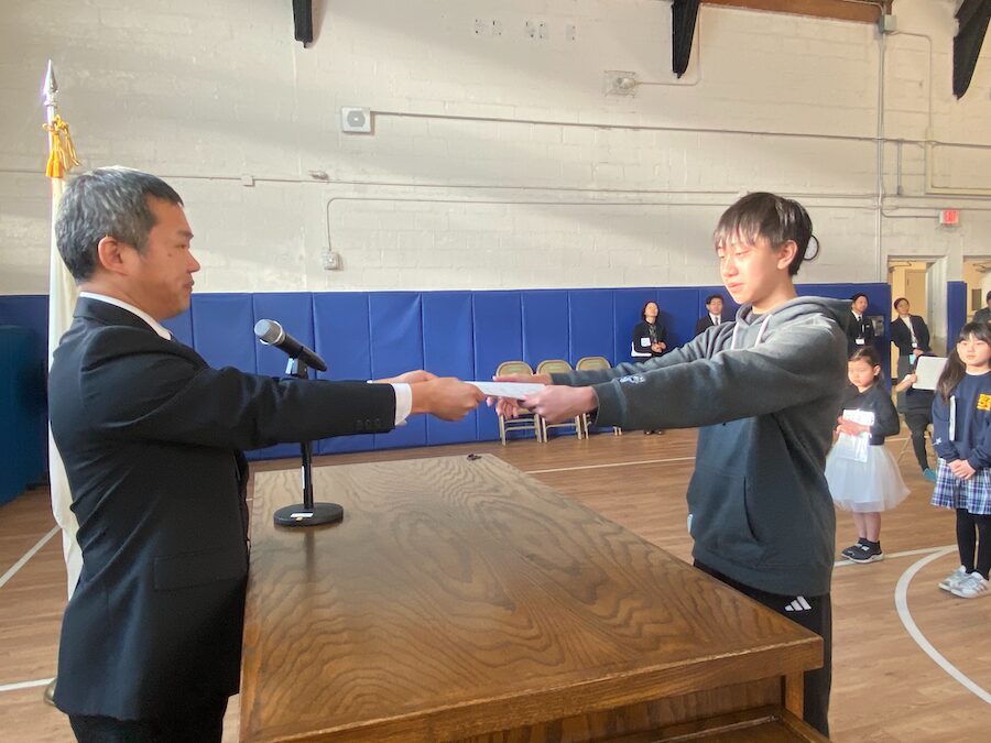 ニューヨーク日本人学校(コネティカット州グリニッチ、森本恵作校長)は3月10日、修了式を開催した。森本校長が児童生徒代表に修了証書を手渡し、児童生徒もそれぞれ晴れやかな表情で受け取り、この1年が充実したものであったことがうかがえた。森本校長は学習や行事、活動を振り返り、子どもたちの成長を称えた。