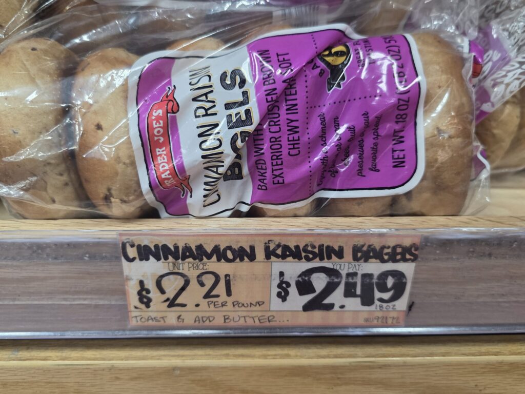 生地がみっちり詰まってちょっと重めのニューヨークスタイルのベーグルとは違い、軽い食感が特徴。トーストするとシナモンの香りが引き立ち、クリームチーズとの相性も抜群。レーズンもジューシー、塩味が強すぎず、この価格でこの味は、はっきり言って「めっけもん」。価格:2.49ドル