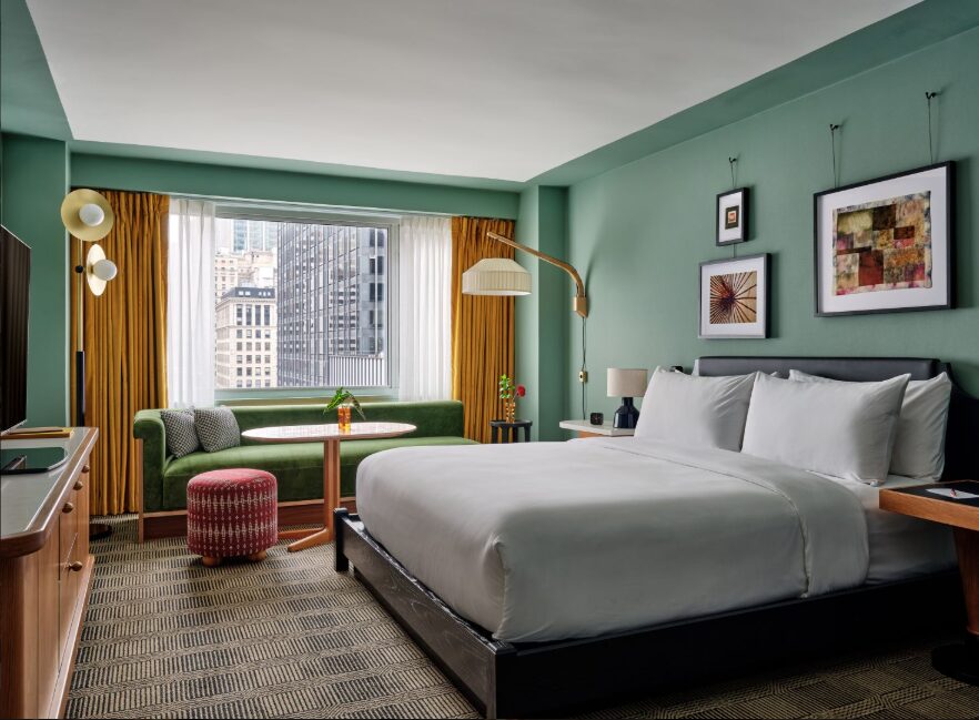 タイムズスクエアや劇場街に近く、繁華街のど真ん中に位置しながらも落ち着いた雰囲気。客室は広めで、ニューヨークでは珍しくゆったり過ごせるのが魅力。ローカル文化を取り入れたデザインやサービスも特徴。