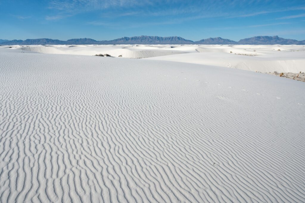 最大で約60フィート(約18メートル)にも及ぶ世界最大の石膏砂丘。パウダースノーのような砂は、約1億年前の浅い海が干上がってできた結晶が風化したもの。熱を吸収しにくく、真夏でも裸足で歩ける。幻想的な景観で知られ、日の出と日没時は砂丘が金色やピンク色に輝き、この世のものとは思えない美しさとなる。