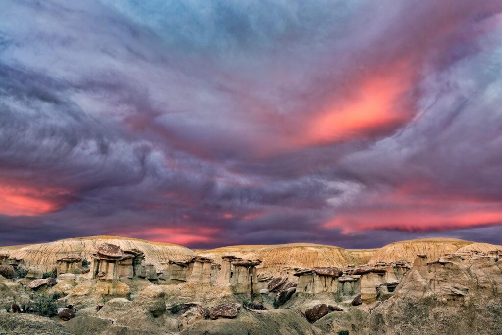 まるで月の表面のような景観が広がり、縞模様のバッドランドや奇妙な形のフードゥー(岩柱)が点在している。ここでは、恐竜の骨や珪化木(けいかぼく)などの化石も見つかることで知られている。