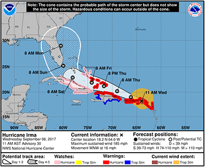 猛烈ハリケーン「イルマ」が接近 風速185マイル