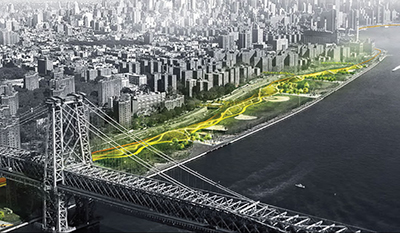 イースト川沿いの公園建設遅延 洪水から町を守る防潮堤として
