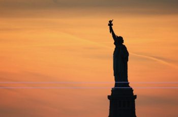 自由の女神に「難民を歓迎」 活動家グループが抗議運動