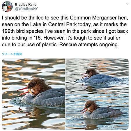 セントラルパークのカモ救助へ プラスチックがくちばしに、餌食べられず