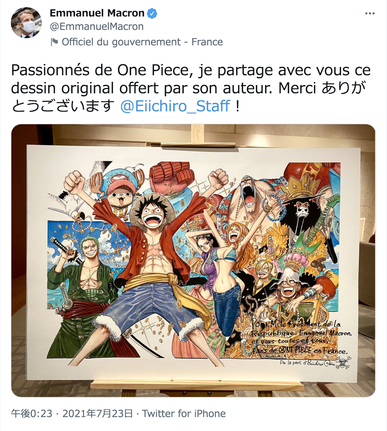 フランスの、大統領とすべてのワンピースファンへ 作者の尾田栄一郎氏、オリジナルイラストをプレゼント
