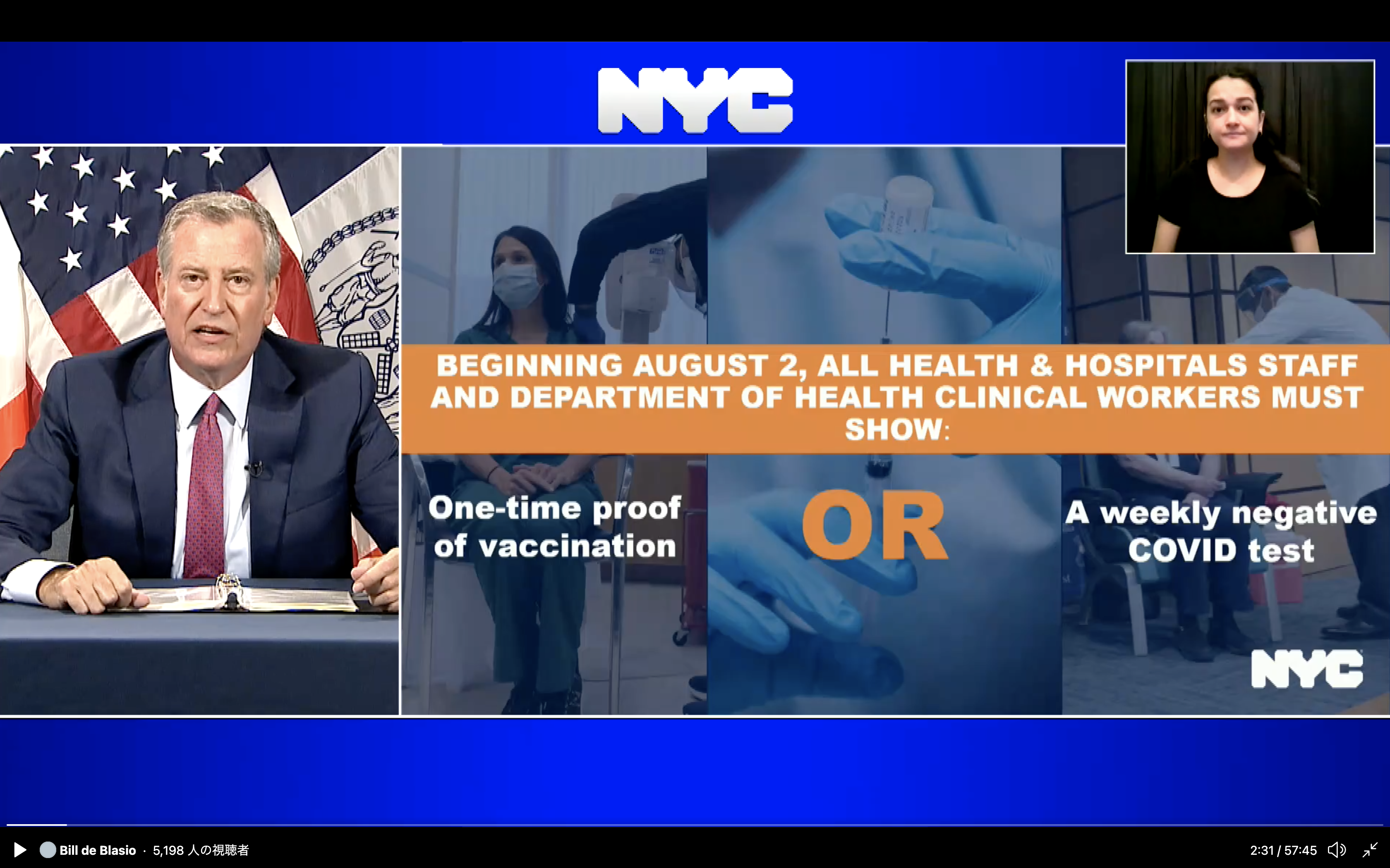 医療従事者にワクチン義務付け 「責任ある行動を」とデブラシオ市長